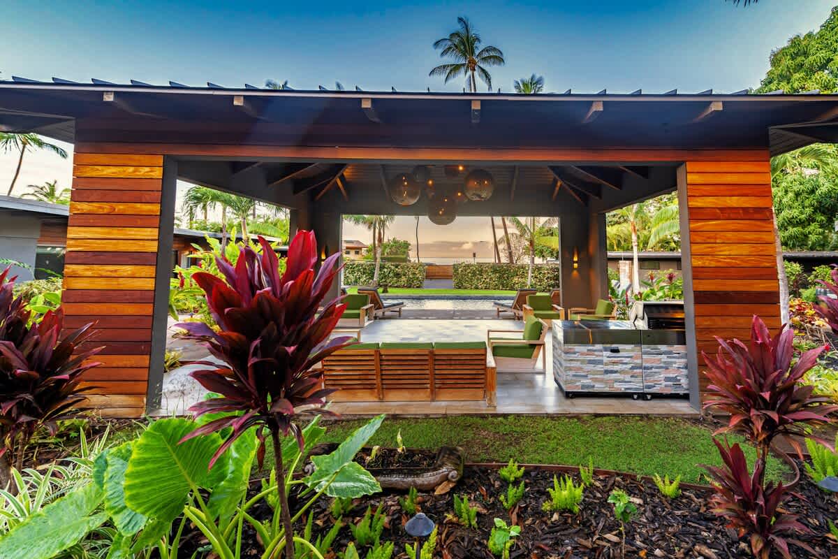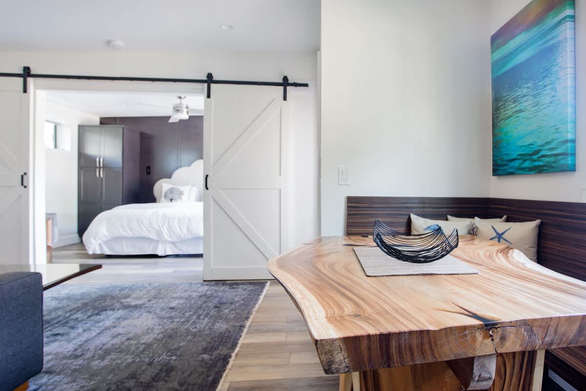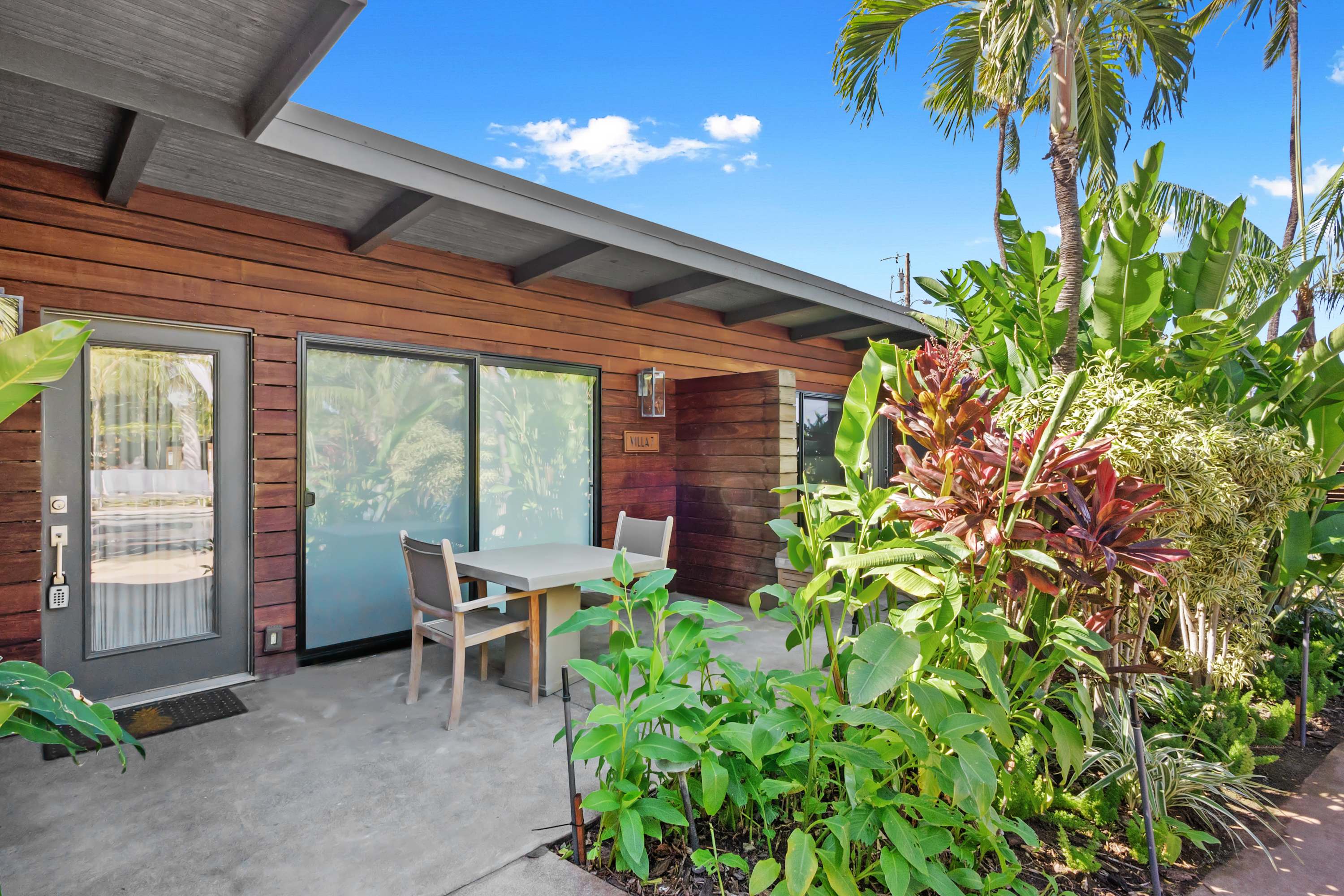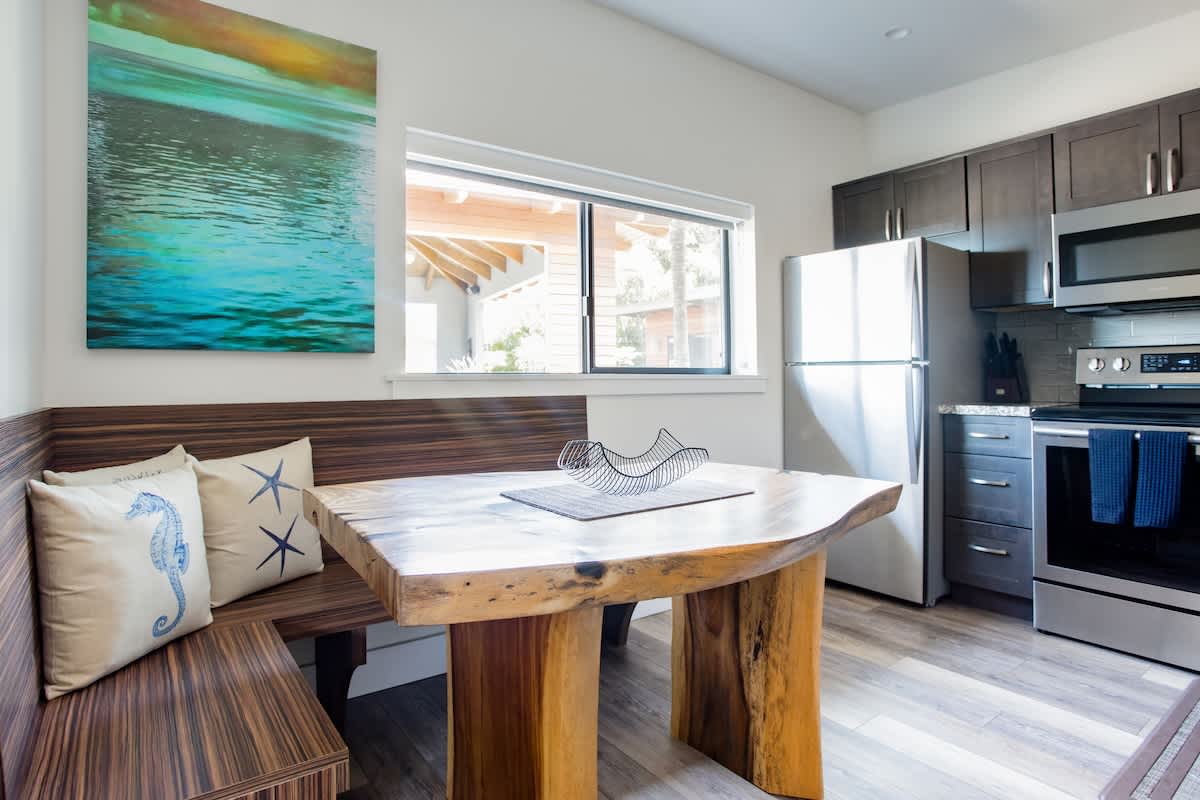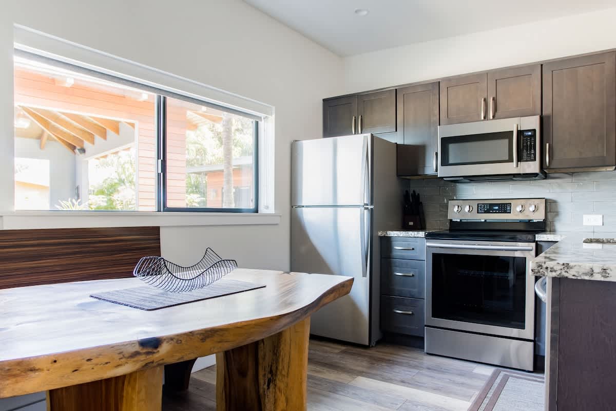 Sit down to breakfast at a live-edge table in a nook of the kitchen featuring classic wood floors and granite surfaces. Head out to a shared terrace to relax in the sun amid tropical foliage before jumping into the pool for a swim.