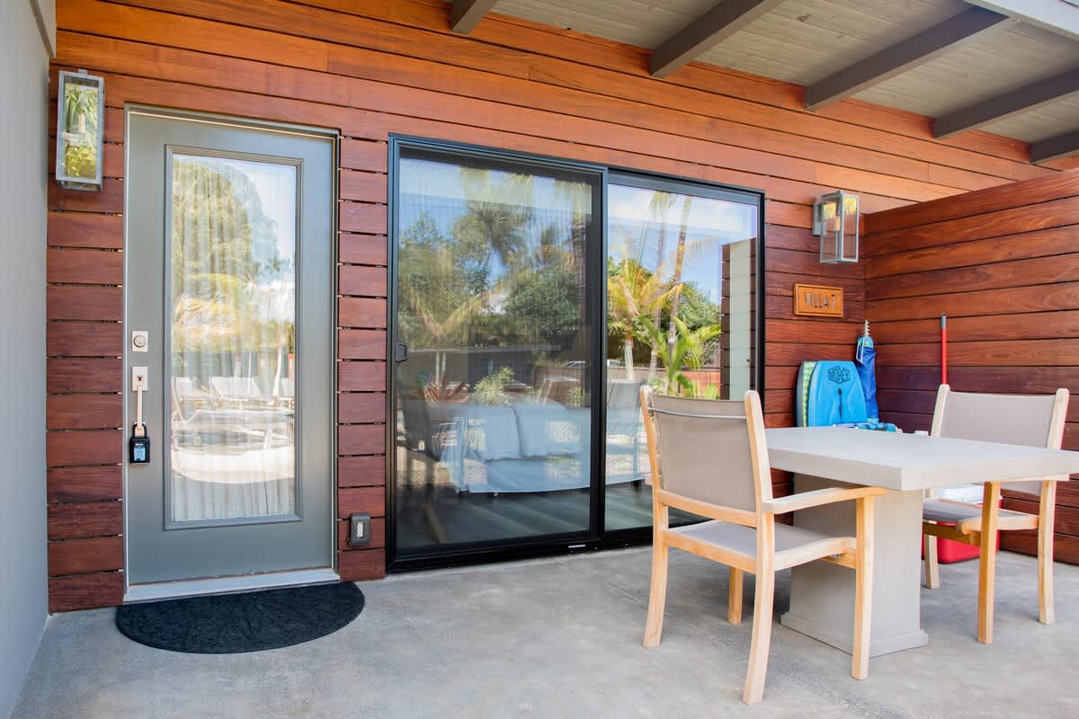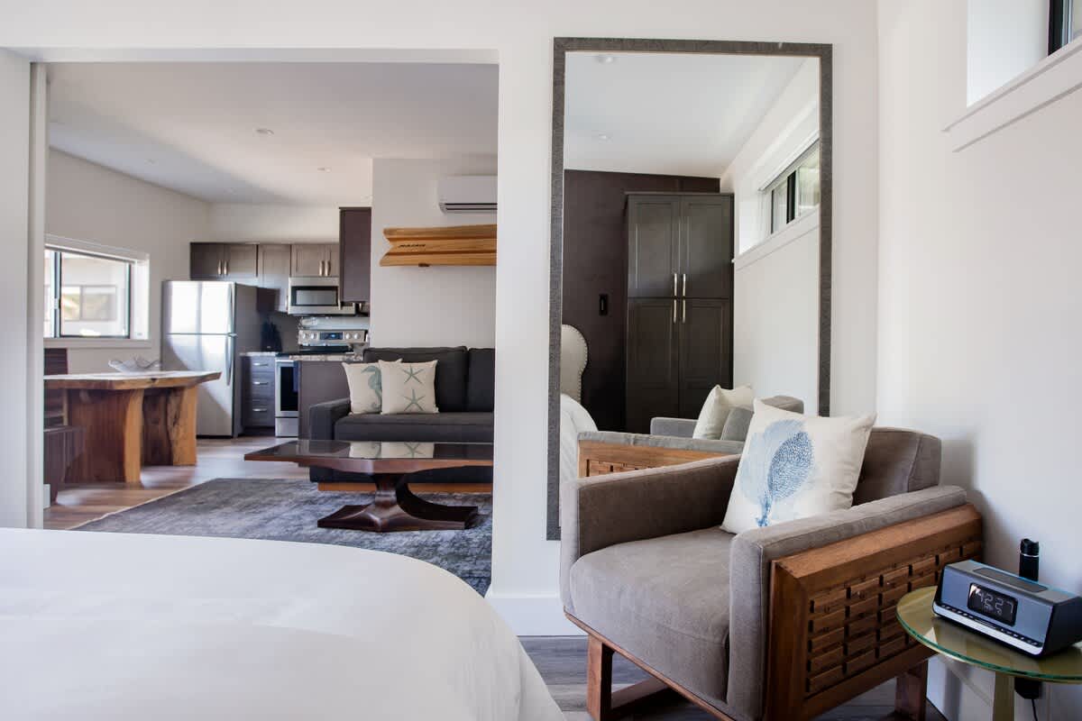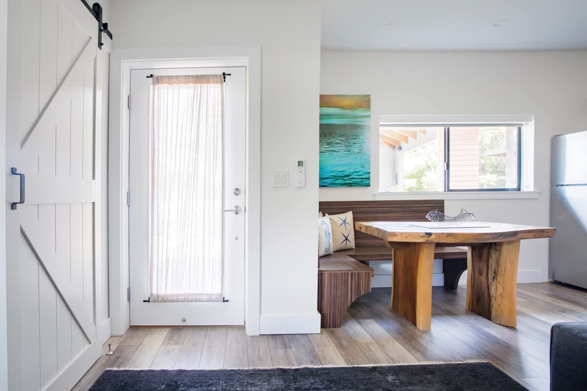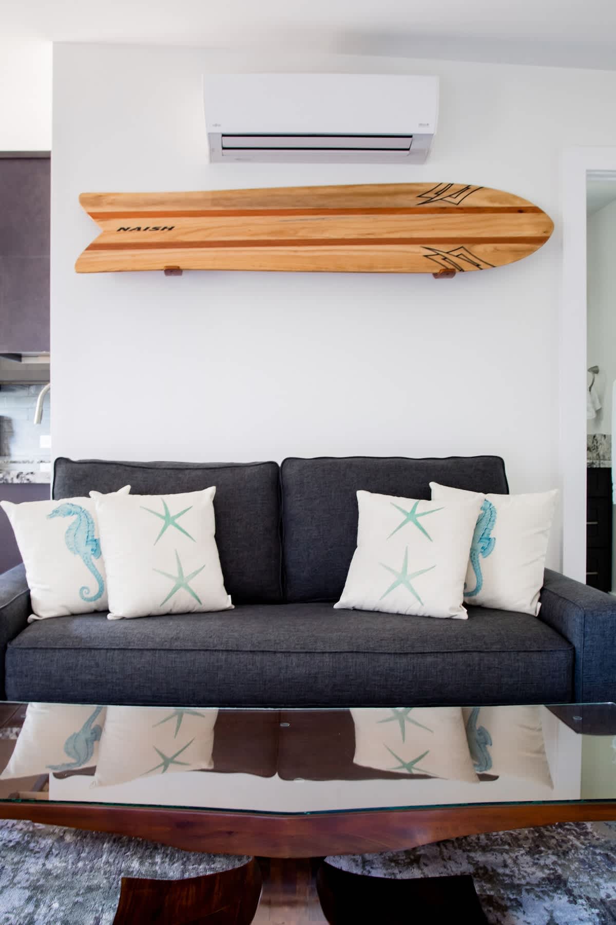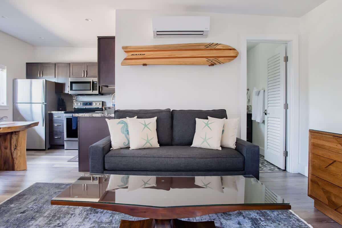 Sit down to breakfast at a live-edge table in a nook of the kitchen featuring classic wood floors and granite surfaces. Head out to a shared terrace to relax in the sun amid tropical foliage before jumping into the pool for a swim.