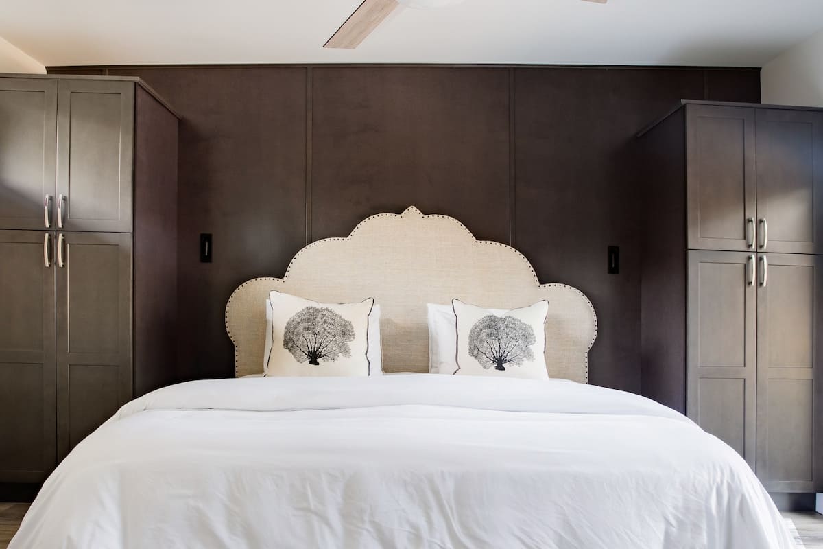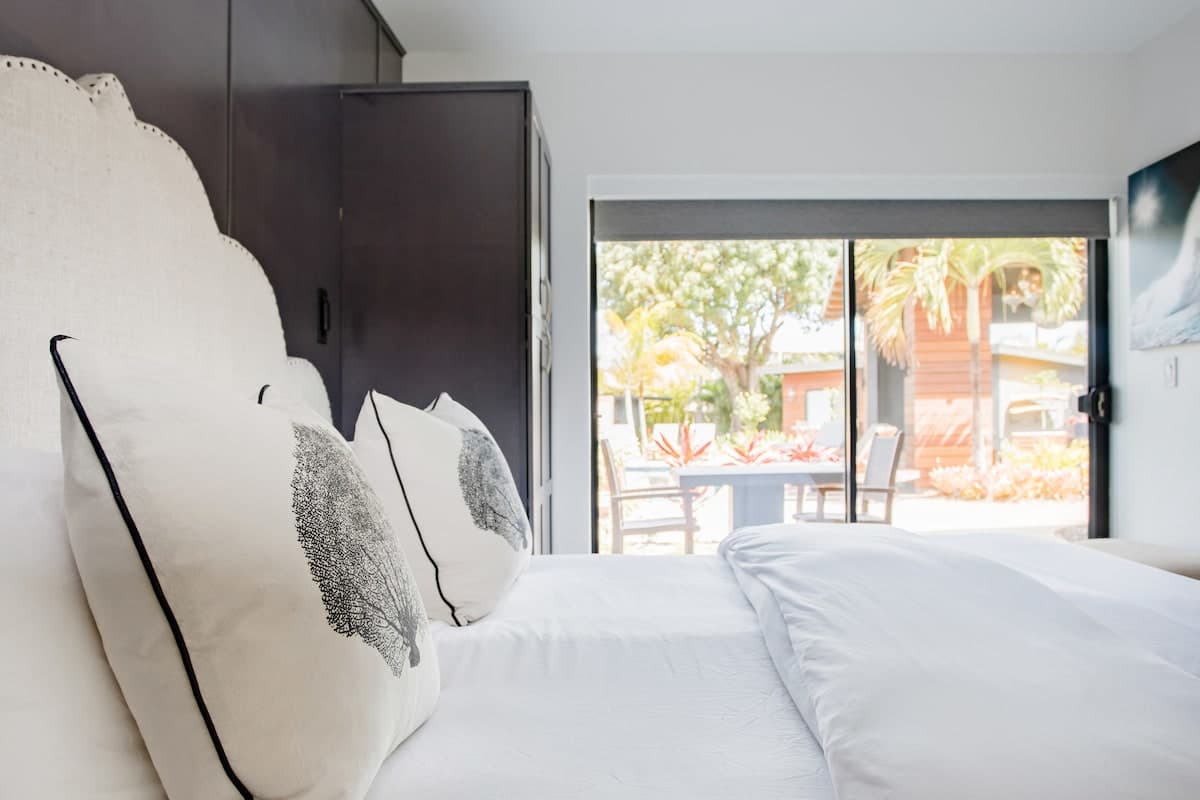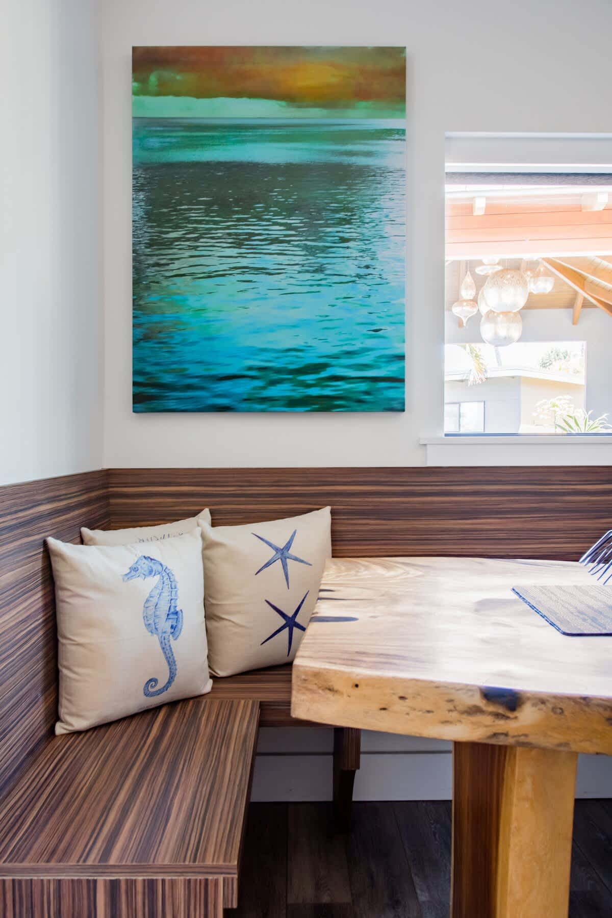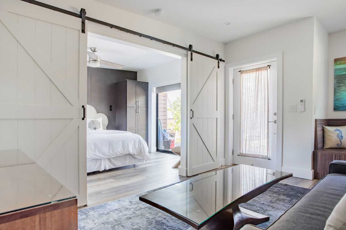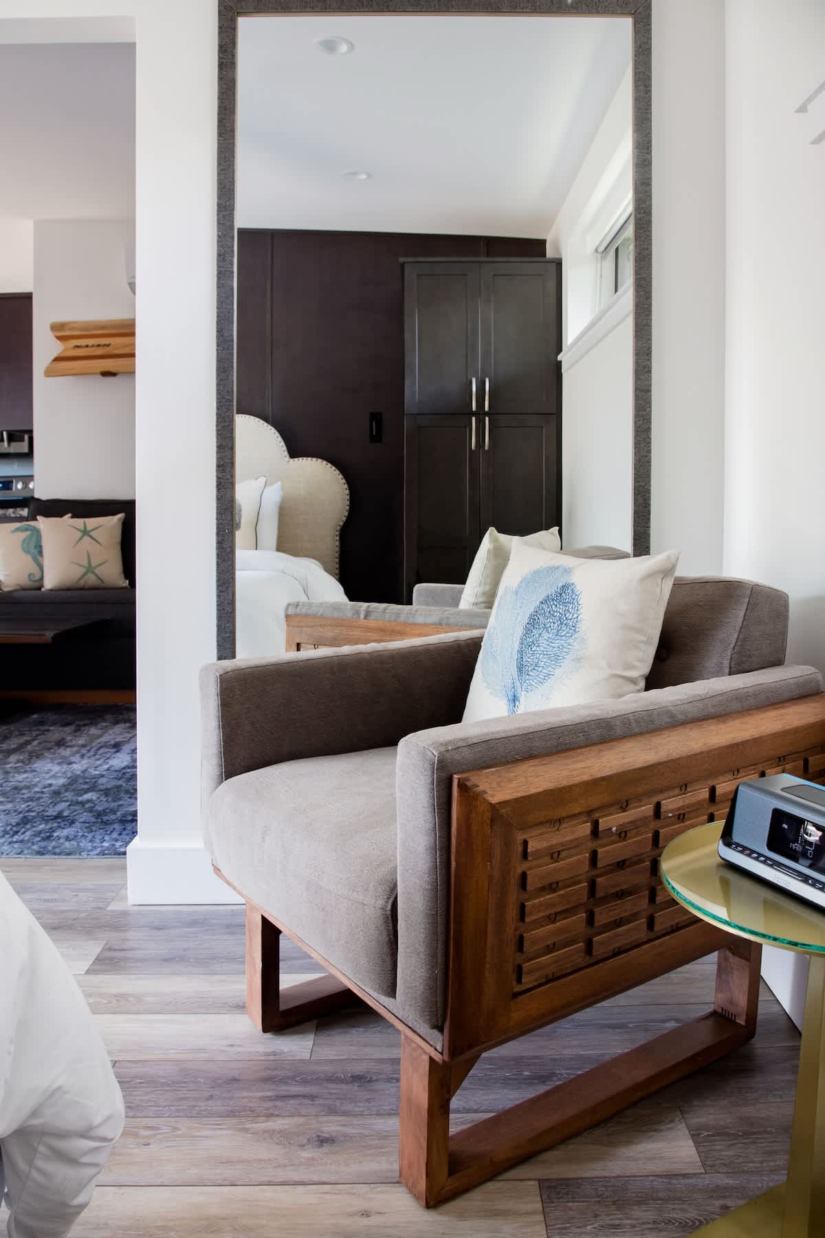 Sit down to breakfast at a live-edge table in a nook of the kitchen featuring classic wood floors and granite surfaces. Head out to a shared terrace to relax in the sun amid tropical foliage before jumping into the pool for a swim.