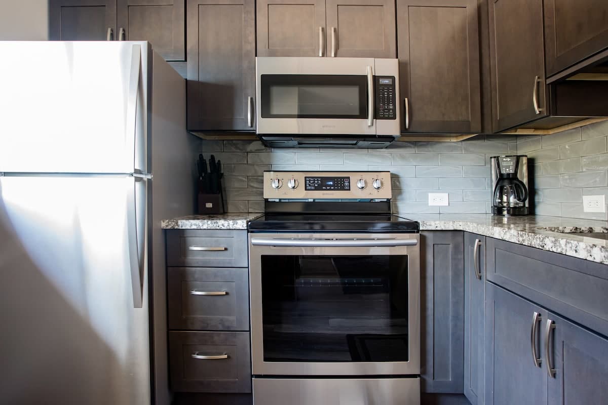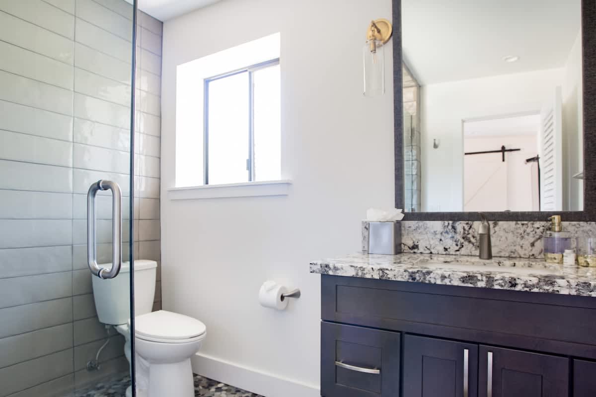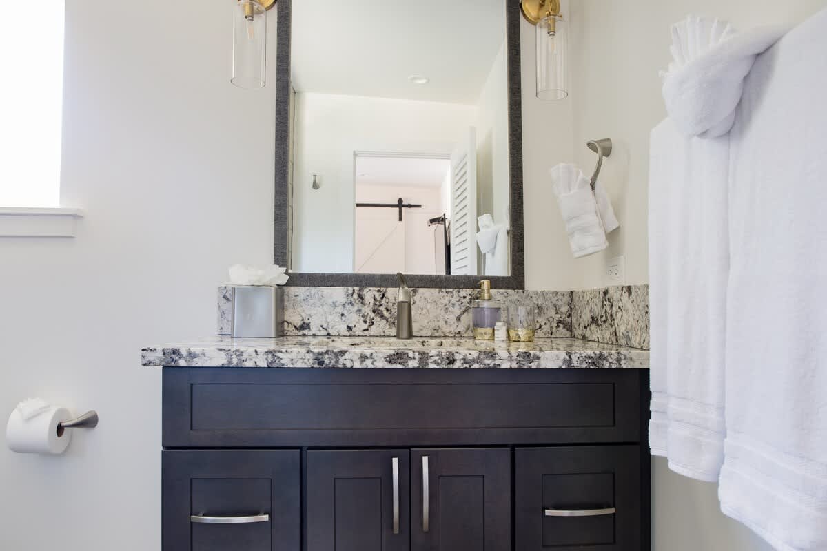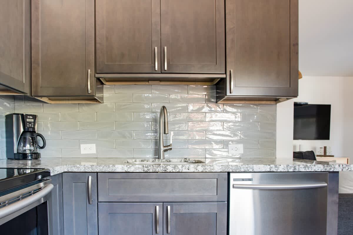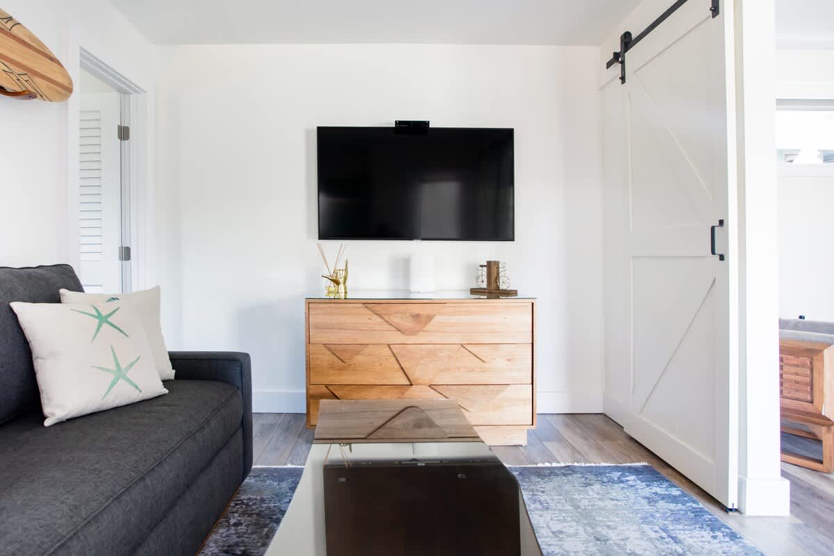 Sit down to breakfast at a live-edge table in a nook of the kitchen featuring classic wood floors and granite surfaces. Head out to a shared terrace to relax in the sun amid tropical foliage before jumping into the pool for a swim.